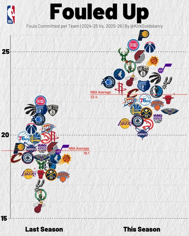 上赛季联盟各队场均犯规数为19.1次;本赛季该数据为22.4次。(数据截至今日赛前)